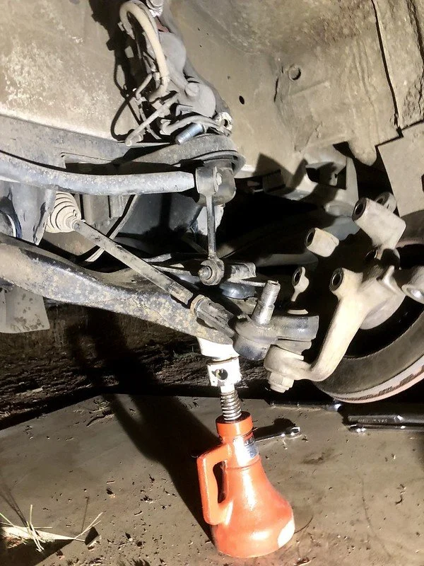 13) With drivers side spring clamp plate at least mostly tightened down, you can reinstall the LCA. Release jack, setting spring tension down onto the spring clamp plate. Here is where I switched to a screw jack underneath the LCA to help push things into place, and be able to line up the LCA into its holes. I also dabbed some grease onto the LCA bushings to help them slide around a little better. Once installed don't tighten all the way, you can do a final LCA tightening with van on ground.