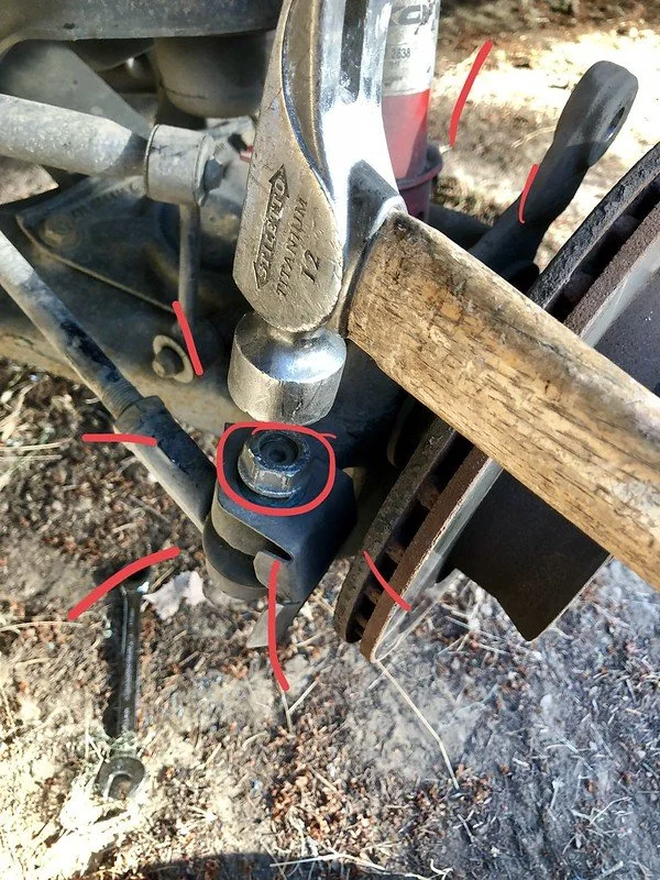 8) Remove the bolts from each side of the drivers side LCA, and pull the LCA and steering knuckle assembly out of the way. IIRC the bolt is 19MM and the nut is 21MM or 7/8"? You can't reach it with a socket so you'll need the proper size wrench.