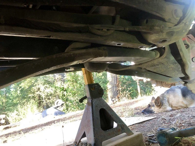 2) Jack van up and support with jackstands. Have a backup, like stack blocks of wood or something similar like use a screw jack to make extra sure you’re extra safe under there.